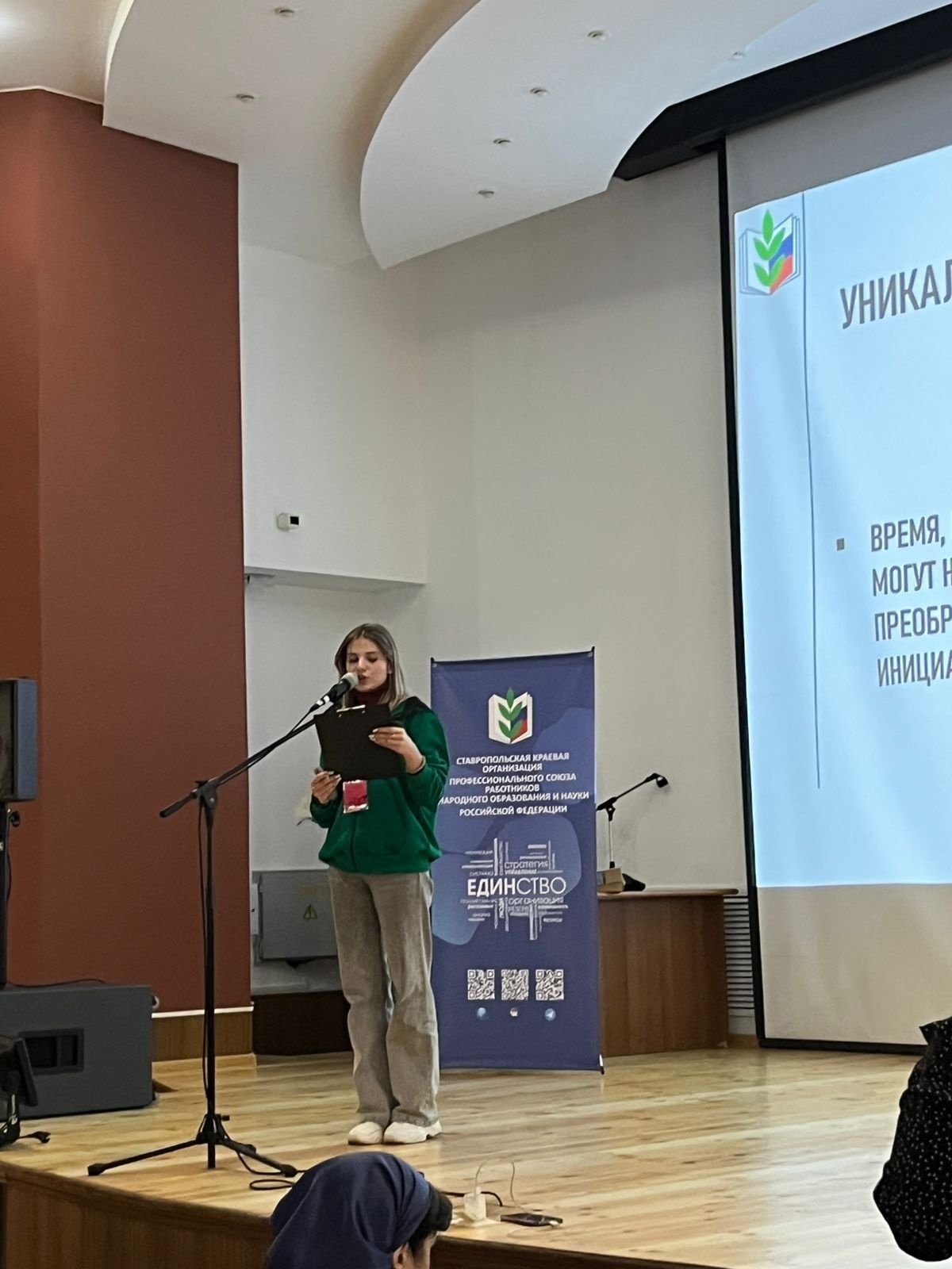 Территориальную организацию Общероссийского Профсоюза образования Предгорного муниципального округа представляла член совета молодых педагогов, учитель МБОУ СОШ N 5 Головачева Алёна Алексеевна, которая ярко представила СМП округа на этом значимом мероприятии.